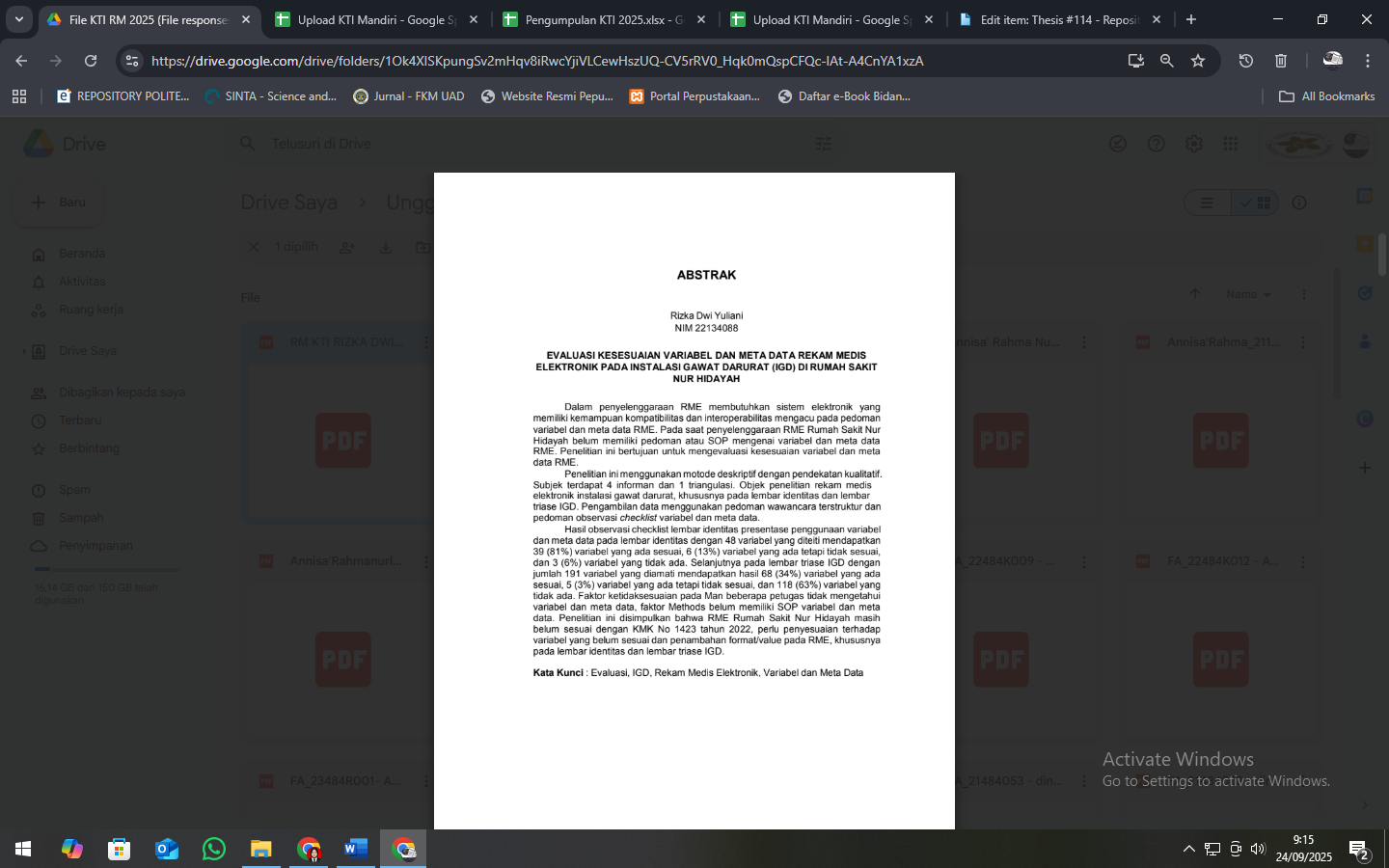 Yuliani, Rizka Dwi and Saputro, Agung Dwi and Kurniawati, Intan (2025) EVALUASI KESESUAIAN VARIABEL DAN META DATA REKAM MEDIS ELEKTRONIK PADA INSTALASI GAWAT DARURAT (IGD) DI RUMAH SAKIT NUR HIDAYAH. Diploma thesis, Politeknik Kesehatan Bhakti Setya Indonesia.