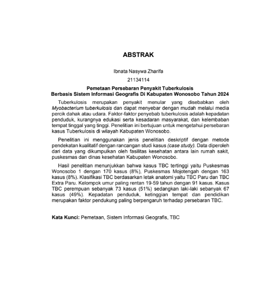 Zharifa, Ibnata Nasywa and Widowati, Vidia and Rohman, Hendra (2025) PEMETAAN PERSEBARAN PENYAKIT TUBERKULOSIS BERBASIS SISTEM INFORMASI GEOGRAFIS DI KABUPATEN WONOSOBO TAHUN 2024. Diploma thesis, Politeknik Kesehatan Bhakti Setya Indonesia.