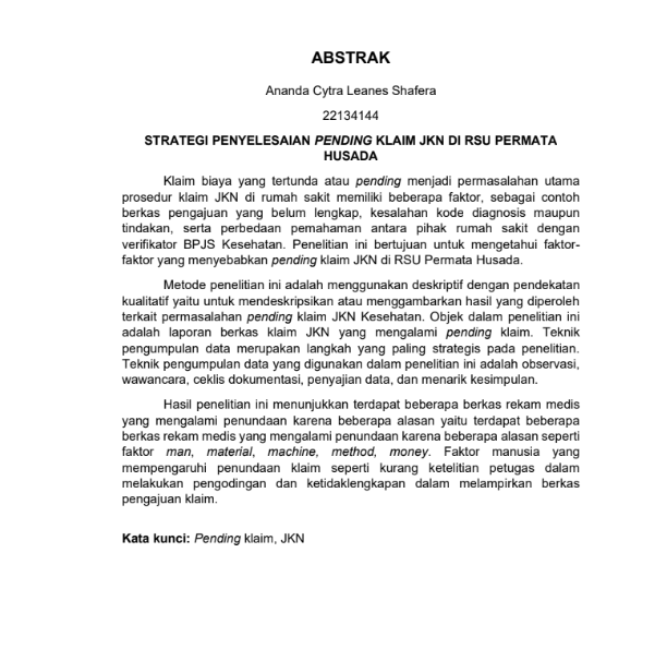 Shafera, Ananda Cytra Leanes and Widowati, Vidia and Mawardi, M. Imron (2025) STRATEGI PENYELESAIAN PENDING KLAIM JKN DI RSU PERMATA HUSADA. Diploma thesis, Politeknik Kesehatan Bhakti Setya Indonesia.