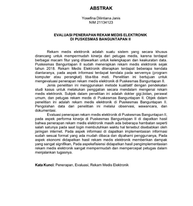 Janis, Yosefina Dilintiana and Sugeng, Sugeng and Rohman, Hendra (2024) EVALUASI PENERAPAN REKAM MEDIS ELEKTRONIK DI PUSKESMAS BANGUNTAPAN II. Diploma thesis, Politeknik Kesehatan Bhakti Setya Indonesia.