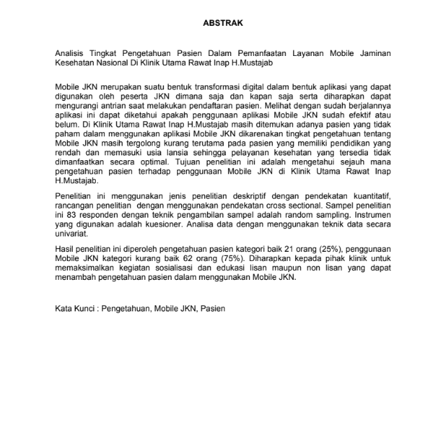 Atmaliah, Koriyatun and Saputro, Agung Dwi and Rahmatullah, Widia (2025) ANALISIS TINGKAT PENGETAHUAN PASIEN DALAM PEMANFAATAN LAYANAN MOBILE JAMINAN KESEHATAN NASIONAL DI KLINIK UTAMA RAWAT INAP H.MUSTAJAB. Diploma thesis, Politeknik Kesehatan Bhakti Setya Indonesia.
