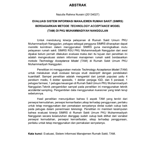 Nuraini, Nazulla Rahma and Fitriyah, Yuli and Urbanantika, Regita (2025) EVALUASI SISTEM INFORMASI MANAJEMEN RUMAH SAKIT (SIMRS) BERDASARKAN METODE TECHNOLOGY ACCEPTANCE MODEL (TAM) DI PKU MUHAMMADIYAH NANGGULAN. Diploma thesis, Politeknik Kesehatan Bhakti Setya Indonesia.