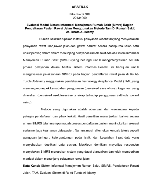 Firanti, Fitra and Saputro, Agung Dwi and Pramono, Pramono (2025) EVALUASI MODUL SISTEM INFORMASI MANAJEMEN RUMAH SAKIT (SIMRS) BAGIAN PENDAFTARAN PASIEN RAWAT JALAN MENGGUNAKAN METODE TAM DI RUMAH SAKIT AT-TUROTS AL-ISLAMY. Diploma thesis, Politeknik Kesehatan Bhakti Setya Indonesia.
