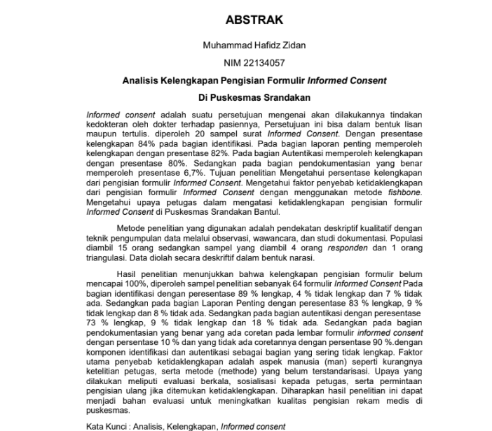 Zidan, Muhammad Hafidz and Kurniawan, Agung and Narendra, Indra (2025) ANALISIS KELENGKAPAN PENGISIAN FORMULIR INFORMED CONSENT DI PUSKESMAS SRANDAKAN BANTUL. Diploma thesis, Politeknik Kesehatan Bhakti Setya Indonesia.