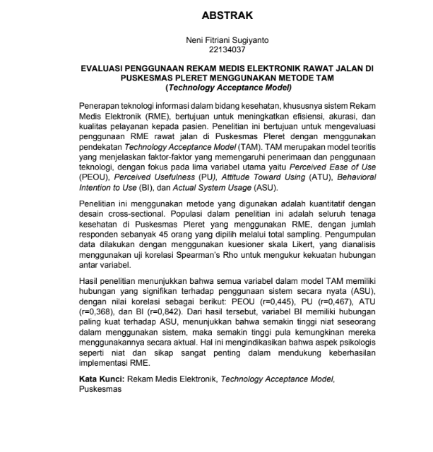 Sugiyanto, Neni Fitriani and Sitanggang, Ferdycov and Sulistyo, Widhi (2025) EVALUASI PENGGUNAAN REKAM MEDIS ELEKTRONIK RAWAT JALAN DI PUSKESMAS PLERET MENGGUNAKAN METODE TAM (Technology Acceptance Model). Diploma thesis, Politeknik Kesehatan Bhakti Setya Indonesia.