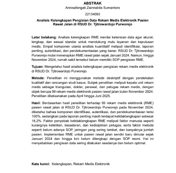 Sumantoro, Annisafangati Zainnabila and Fitriyah, Yuli and Kristiyono, Eddy (2025) ANALISIS KELENGKAPAN PENGISIAN DATA REKAM MEDIS ELEKTRONIK PASIEN RAWAT JALAN DI RSUD DR. TJITROWARDOJO PURWOREJO TAHUN 2024. Diploma thesis, Politeknik Kesehatan Bhakti Setya Indonesia.