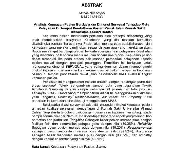 Asyva, Azizah Nur and Mawardi, M. Imron and Saputro, Agung Dwi (2025) ANALISIS KEPUASAN PASIEN BERDASARKAN DIMENSI SERVQUAL TERHADAP MUTU PELAYANAN DI TEMPAT PENDAFTARAN PASIEN RAWAT JALAN RUMAH SAKIT UNIVERSITAS AHMAD DAHLAN. Diploma thesis, Politeknik Kesehatan Bhakti Setya Indonesia.
