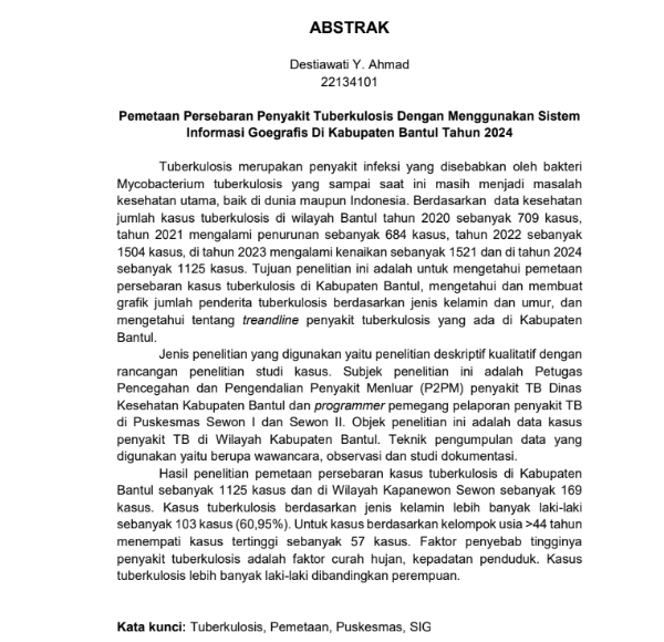Hasil penelitian pemetaan persebaran kasus tuberkulosis di Kabupaten Bantul sebanyak 1125 kasus dan di Wilayah Kapanewon Sewon sebanyak 169 kasus. Kasus tuberkulosis berdasarkan jenis kelamin lebih banyak laki-laki sebanyak 103 kasus (60,95%). Untuk kasus berdasarkan kelompok usia >44 tahun menempati kasus tertinggi sebanyak 57 kasus. Faktor penyebab tingginya penyakit tuberkulosis adalah faktor curah hujan, kepadatan penduduk. Kasus tuberkulosis lebih banyak laki-laki dibandingkan perempuan.