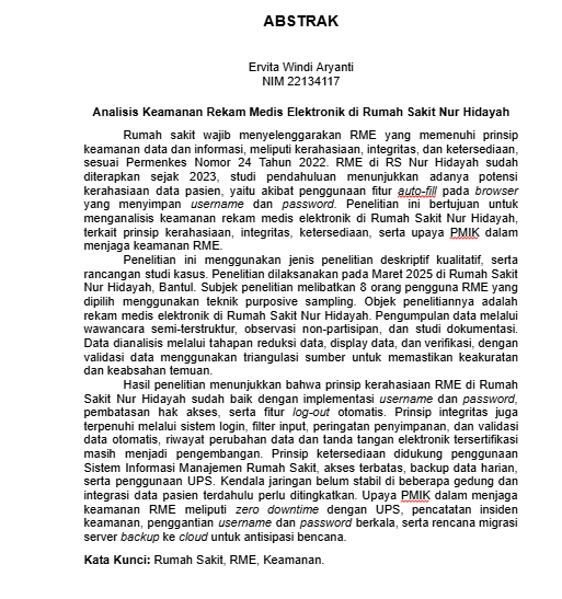 Aryanti, Ervita Windi and Sulistyo, Widhi and Narendra, Indra (2025) ANALISIS KEAMANAN REKAM MEDIS ELEKTRONIK DI RUMAH SAKIT NUR HIDAYAH. Diploma thesis, Politeknik Kesehatan Bhakti Setya Indonesia.