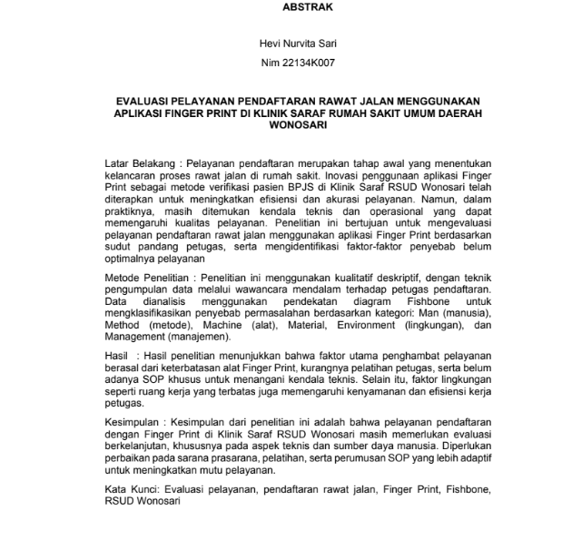 Kesimpulan : Kesimpulan dari penelitian ini adalah bahwa pelayanan pendaftaran dengan Finger Print di Klinik Saraf RSUD Wonosari masih memerlukan evaluasi berkelanjutan, khususnya pada aspek teknis dan sumber daya manusia. Diperlukan perbaikan pada sarana prasarana, pelatihan, serta perumusan SOP yang lebih adaptif untuk meningkatkan mutu pelayanan.