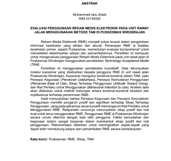 Jihadi, Muhammad Iqra and Darsono, Darsono and Sari, Ana Lukita Dewi (2025) EVALUASI PENGGUNAAN REKAM MEDIS ELEKTRONIK PADA UNIT RAWAT JALAN MENGGUNAKAN METODE TAM DI PUSKESMAS WIROBRAJAN. Diploma thesis, Politeknik Kesehatan Bhakti Setya Indonesia.