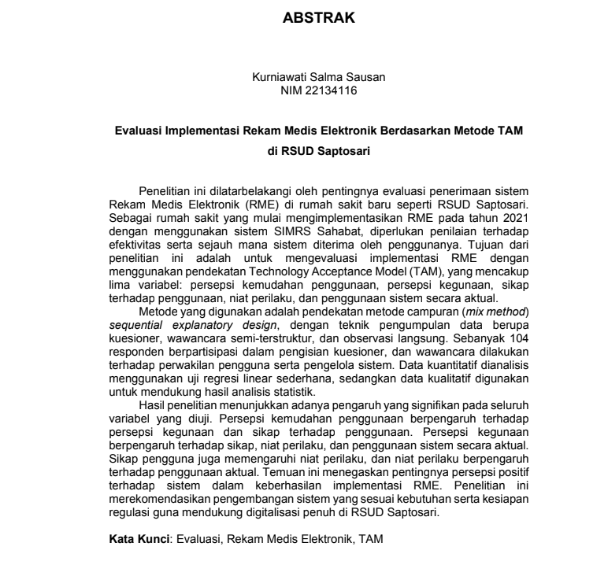 Sausan, Kurniawati Salma and Urbanantika, Regita and Sulaiman, Fadia (2025) EVALUASI IMPLEMENTASI REKAM MEDIS ELEKTRONIK BERDASARKAN METODE TAM DI RSUD SAPTOSARI. Diploma thesis, Politeknik Kesehatan Bhakti Setya Indonesia.