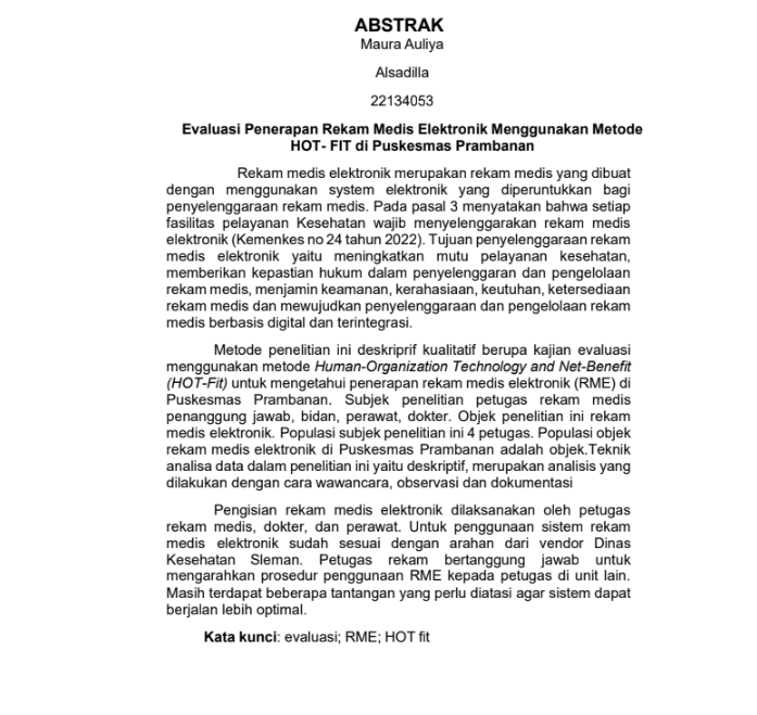 Alsadilla, Maura Auliya and Rohman, Hendra and Rahmatullah, Widia (2025) EVALUASI PENERAPAN REKAM MEDIS ELEKTRONIK BEDASARKAN METODE HOT-FIT DI PUSKESMAS PRAMBANAN. Diploma thesis, Politeknik Kesehatan Bhakti Setya Indonesia.