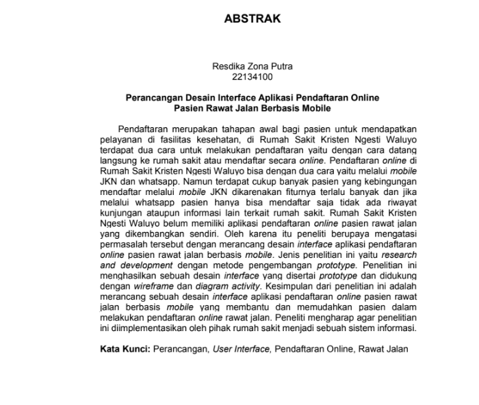 Pendaftaran merupakan tahapan awal bagi pasien untuk mendapatkan pelayanan di fasilitas kesehatan, di Rumah Sakit Kristen Ngesti Waluyo terdapat dua cara untuk melakukan pendaftaran yaitu dengan cara dating langsung ke rumah sakit atau mendaftar secara online. Pendaftaran online di Rumah Sakit Kristen Ngesti Waluyo bisa dengan dua cara yaitu melalui mobile JKN dan whatsapp. Namun terdapat cukup banyak pasien yang kebingungan mendaftar melalui mobile JKN dikarenakan fiturnya terlalu banyak dan jika melalui whatsapp pasien hanya bisa mendaftar saja tidak ada Riwayat kunjungan ataupun informasi lain terkait rumah sakit. Rumah Sakit Kristen Ngesti Waluyo belum memiliki aplikasi pendaftaran online pasien rawat jalan yang dikembangkan sendiri. Oleh karena itu peneliti berupaya mengatasi permasalah tersebut dengan merancang desain interface aplikasi pendaftaran online pasien rawat jalan berbasis mobile. Jenis penelitian ini yaitu research and development dengan metode pengembangan prototype. Penelitian ini menghasilkan sebuah desain interface yang disertai prototype dan didukung dengan wireframe dan diagram activity. Kesimpulan dari penelitian ini adalah merancang sebuah desain interface aplikasi pendaftaran online pasien rawat jalan berbasis mobile yang membantu dan memudahkan pasien dalam melakukan pendaftaran online rawat jalan. Peneliti mengharap agar penelitian ini diimplementasikan oleh pihak rumah sakit menjadi sebuah sistem informasi.