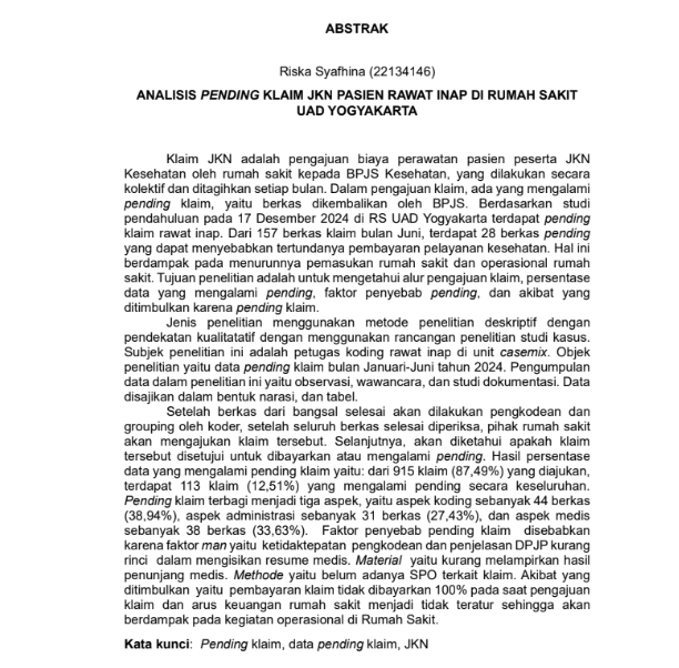 Klaim JKN adalah pengajuan biaya perawatan pasien peserta JKN Kesehatan oleh rumah sakit kepada BPJS Kesehatan, yang dilakukan secara kolektif dan ditagihkan setiap bulan. Dalam pengajuan klaim, ada yang mengalami pending klaim, yaitu berkas dikembalikan oleh BPJS. Berdasarkan studi pendahuluan pada 17 Desember 2024 di RS UAD Yogyakarta terdapat pending klaim rawat inap. Dari 157 berkas klaim bulan Juni, terdapat 28 berkas pending yang dapat menyebabkan tertundanya pembayaran pelayanan kesehatan. Hal ini berdampak pada menurunnya pemasukan rumah sakit dan operasional rumah sakit. Tujuan penelitian adalah untuk mengetahui alur pengajuan klaim, persentase data yang mengalami pending, faktor penyebab pending, dan akibat yang ditimbulkan karena pending klaim.