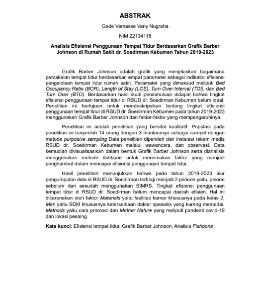 Nugraha, Gede Vemasse Vany and Fitriana, Syarah Mazaya and Rustiyanto, Ery (2025) ANALISIS EFISIENSI PENGGUNAAN TEMPAT TIDUR BERDASARKAN GRAFIK BARBER JOHNSON DI RUMAH SAKIT dr. SOEDIRMAN KEBUMEN TAHUN 2019-2023. Diploma thesis, Politeknik Kesehatan Bhakti Setya Indonesia.