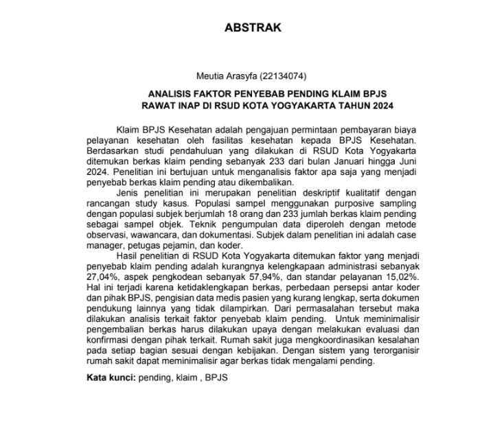 Arasyfa, Meutia and Sugeng, Sugeng and Sulaiman, Fadia (2025) ANALISIS FAKTOR PENYEBAB PENDING KLAIM BPJS RAWAT INAP DI RSUD KOTA YOGYAKARTA TAHUN 2024. Diploma thesis, Politeknik Kesehatan Bhakti Setya Indonesia.