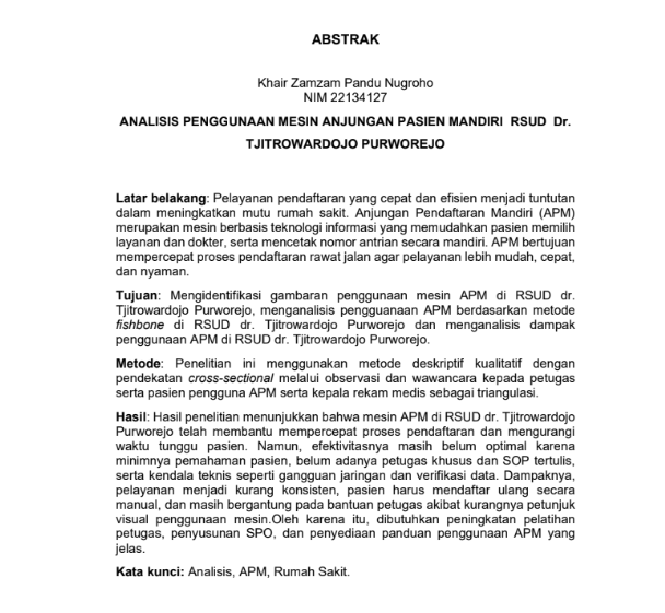 Nugroho, Khair Zamzam Pandu and Urbanantika, Regita and Sari, Ana Lukita Dewi (2025) ANALISIS PENGGUNAAN MESIN ANJUNGAN PASIEN MANDIRI RSUD Dr. TJITROWARDOJO PURWOREJO. Diploma thesis, Politeknik Kesehatan Bhakti Setya Indonesia.