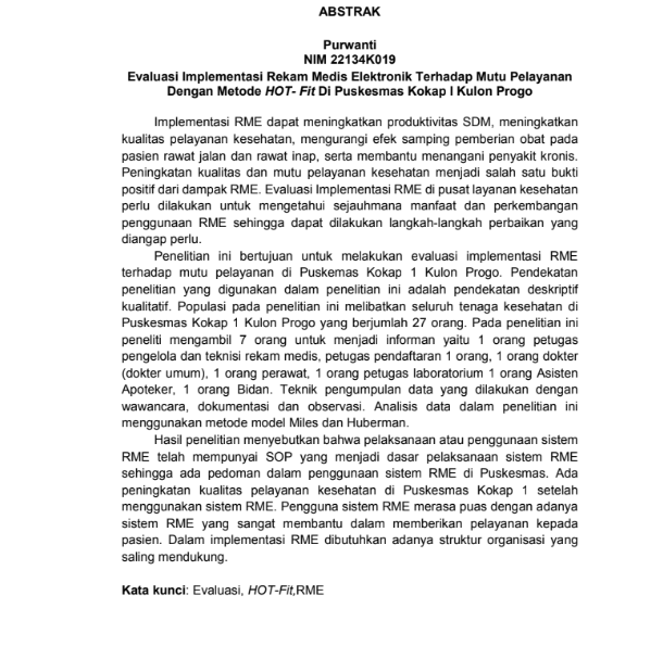 Penelitian ini bertujuan untuk melakukan evaluasi implementasi RME terhadap mutu pelayanan di Puskemas Kokap 1 Kulon Progo. Pendekatan penelitian yang digunakan dalam penelitian ini adalah pendekatan deskriptif kualitatif. Populasi pada penelitian ini melibatkan seluruh tenaga kesehatan di Puskesmas Kokap 1 Kulon Progo yang berjumlah 27 orang. Pada penelitian ini peneliti mengambil 7 orang untuk menjadi informan yaitu 1 orang petugas pengelola dan teknisi rekam medis, petugas pendaftaran 1 orang, 1 orang dokter (dokter umum), 1 orang perawat, 1 orang petugas laboratorium 1 orang Asisten Apoteker, 1 orang Bidan. Teknik pengumpulan data yang dilakukan dengan wawancara, dokumentasi dan observasi. Analisis data dalam penelitian ini menggunakan metode model Miles dan Huberman.