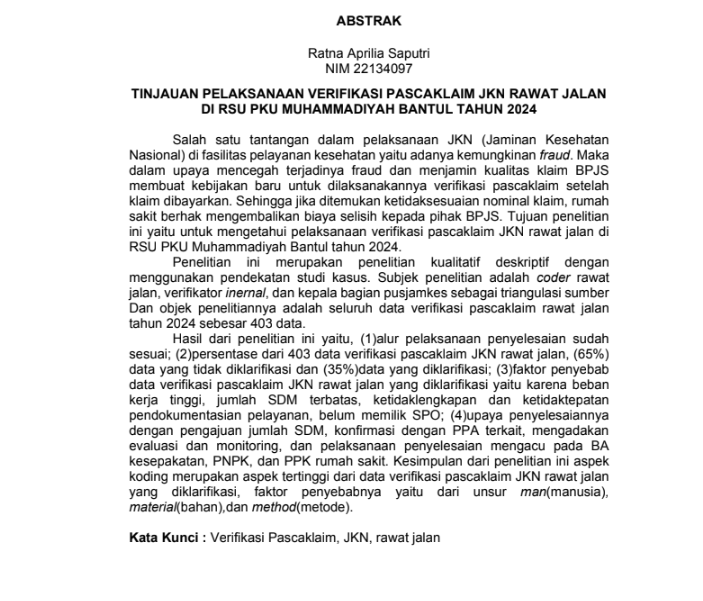 Saputri, Ratna Aprilia and Widowati, Vidia and Setyawan, Hery (2025) TINJAUAN PELAKSANAAN VERIFIKASI PASCAKLAIM JKN RAWAT JALAN DI RSU PKU MUHAMMADIYAH BANTUL TAHUN 2024. Diploma thesis, Politeknik Kesehatan Bhakti Setya Indonesia.