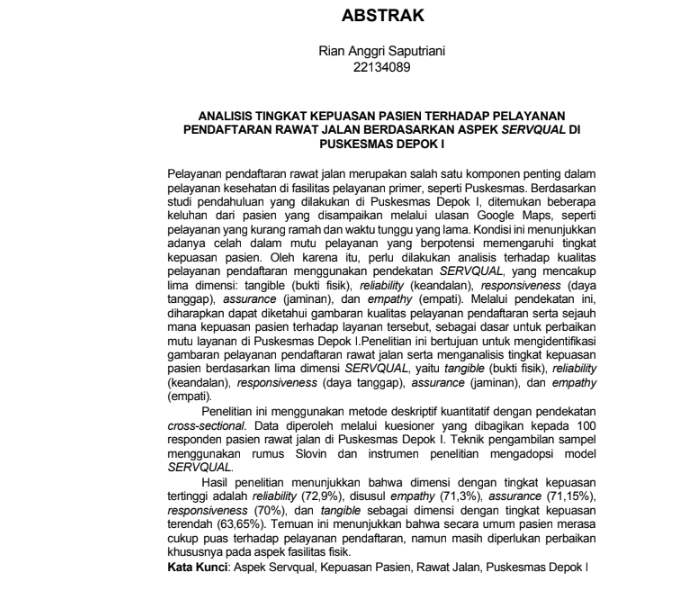Saputriani, Rian Anggri and Urbanantika, Regita and Sulaiman, Fadia (2025) ANALISIS TINGKAT KEPUASAN PASIEN TERHADAP PELAYANAN PENDAFTARAN RAWAT JALAN BERDASARKAN ASPEK SERVQUAL DI PUSKESMAS DEPOK I. Diploma thesis, Politeknik Kesehatan Bhakti Setya Indonesia.