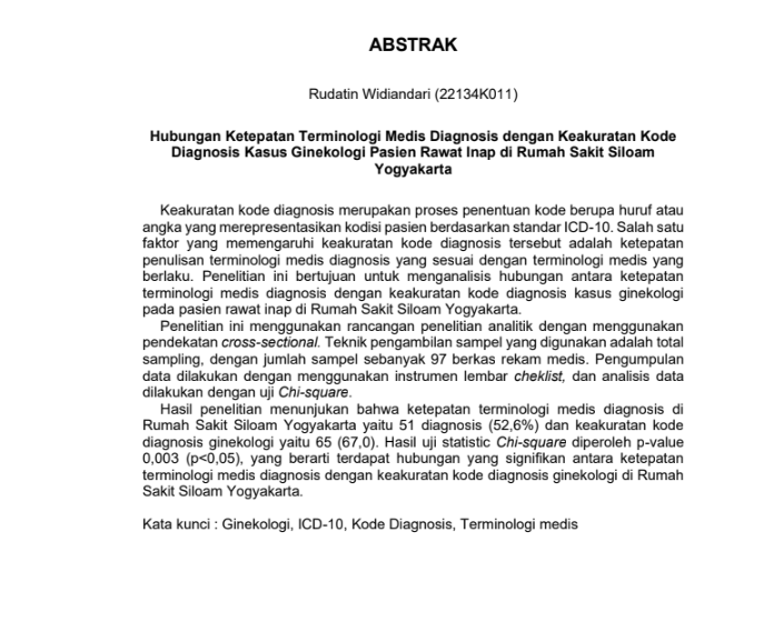 Widiandari, Rudatin and Sari, Ana Lukita Dewi and Widowati, Vidia (2025) HUBUNGAN KETEPATAN TERMINOLOGI MEDIS DIAGNOSIS DENGAN KEAKURATAN KODE DIAGNOSIS KASUS GINEKOLOGI PASIEN RAWAT INAP DI RUMAH SAKIT SILOAM YOGYAKARTA. Diploma thesis, Politeknik Kesehatan Bhakti Setya Indonesia.
