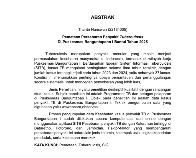 Nariswari, Thantri and Urbanantika, Regita and Mawardi, M. Imron (2025) PEMETAAN PERSEBARAN PENYAKIT TUBERCULOSIS DI PUSKESMAS BANGUNTAPAN I BANTUL TAHUN 2025. Diploma thesis, Politeknik Kesehatan Bhakti Setya Indonesia.