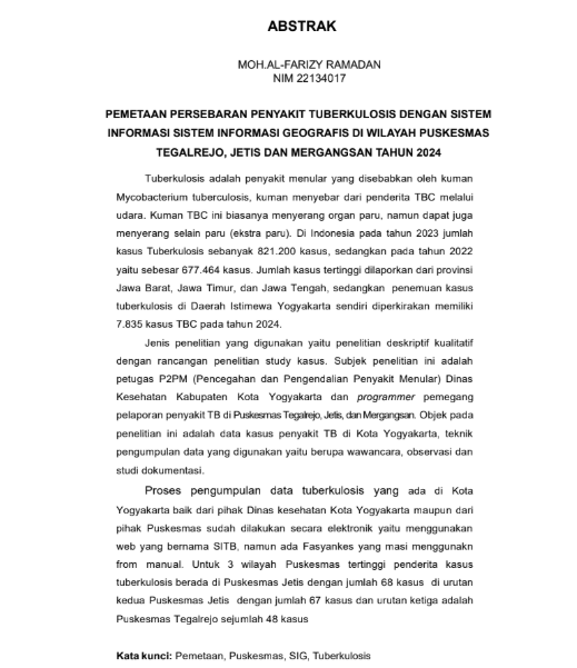 Ramadan, Moh.Al-farizy and Rohman, Hendra and Mawardi, M. Imron (2025) PEMETAAN PERSEBARAN PENYAKIT TUBERKULOSIS DENGAN SISTEM INFORMASI SISTEM INFORMASI GEOGRAFIS DI WILAYAH PUSKESMAS TEGALREJO, JETIS DAN MERGANGSAN TAHUN 2024. Diploma thesis, Politeknik Kesehatan Bhakti Setya Indonesia.