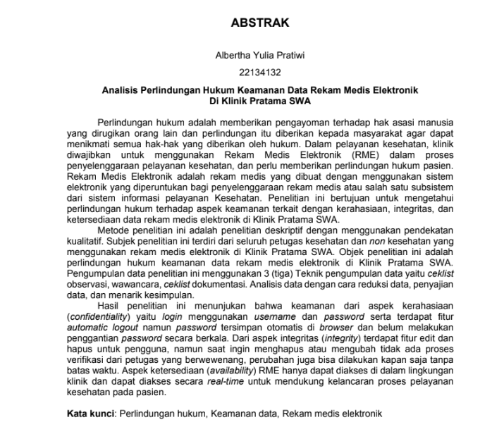 Pratiwi, Albertha Yulia and Narendra, Indra and Darsono, Darsono (2025) ANALISIS PERLINDUNGAN HUKUM KEAMANAN DATA REKAM MEDIS ELEKTRONIK DI KLINIK PRATAMA SWA. Diploma thesis, Politeknik Kesehatan Bhakti Setya Indonesia.