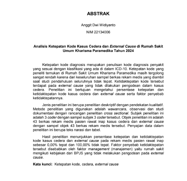 Widiyanto, Anggit Dwi and Widowati, Vidya and Darsono, Darsono (2025) ANALISIS KETEPATAN KODE KASUS CEDERA DAN EXTERNAL CAUSE DI RUMAH SAKIT UMUM KHARISMA PARAMEDIKA TAHUN 2024. Diploma thesis, Politeknik Kesehatan Bhakti Setya Indonesia.