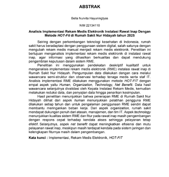 Hayuningtyas, Bella Nurvita and Sugeng, Sugeng and Burhan, Amelia Handayani (2025) ANALISIS IMPLEMENTASI REKAM MEDIS ELEKTRONIK INSTALASI RAWAT INAP DENGAN METODE HOT-FIT DI RUMAH SAKIT NUR HIDAYAH TAHUN 2025. Diploma thesis, Politeknik Kesehatan Bhakti Setya Indonesia.