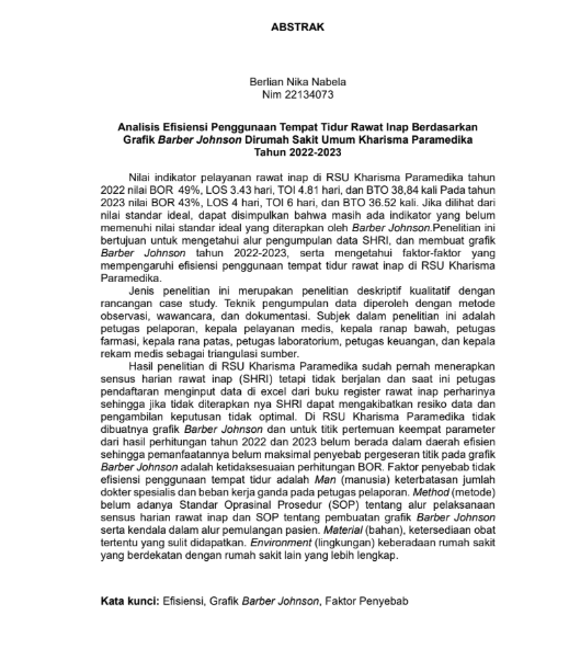 Nabela, Berlian Nika and Rustiyanto, Ery and Burhan, Amelia Handayani (2025) ANALISIS EFISIENSI PENGGUNAAN TEMPAT TIDUR RAWAT INAP BERDASARKAN GRAFIK BARBER JOHNSON DI RUMAH SAKIT UMUM KHARISMA PARAMEDIKA TAHUN 2022-2023. Diploma thesis, Politeknik Kesehatan Bhakti Setya Indonesia.