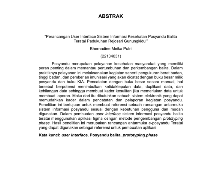 Putri, Bhernadine Meika and Fitriyah, Yuli and Pramono, Pramono (2025) PERANCANGAN USER INTERFACE SISTEM INFORMASI KESEHATAN POSYANDU BALITA TERATAI PADUKUHAN REJOSARI GUNUNGKIDUL. Diploma thesis, Politeknik Kesehatan Bhakti Setya Indonesia.
