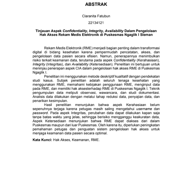 Fatubun, Claranita and Urbanantika, Regita and Narendra, Indra (2025) TINJAUAN ASPEKCONFIDENTIALITY, INTEGRITY, AVAILABILITY DALAM PENGELOLAAN HAK AKSES REKAM MEDIS ELEKTRONIK DI PUSKESMAS NGAGLIK I SLEMAN. Diploma thesis, Politeknik Kesehatan Bhakti Setya Indonesia.