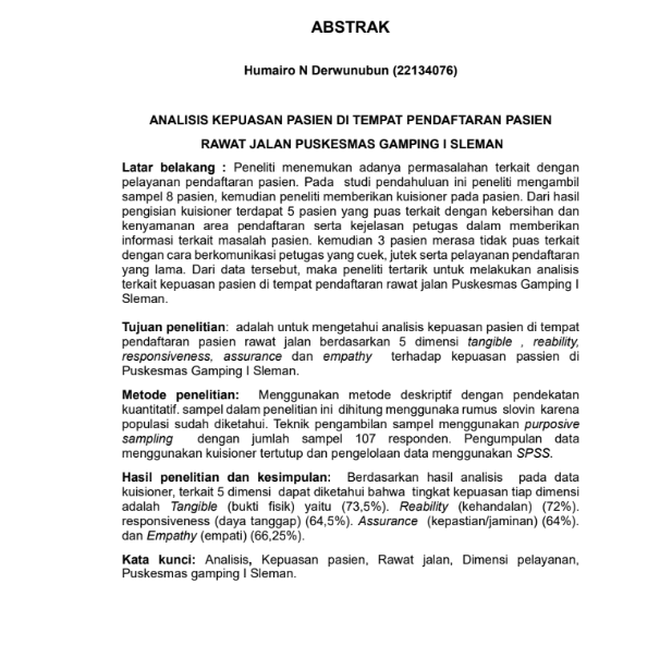 Derwunubun, Humairo N and Mawardi, M. Imron and Sugeng, Sugeng (2025) ANALISIS KEPUASAN PASIEN DI TEMPAT PENDAFTARAN PASIEN RAWAT JALAN PUSKESMAS GAMPING I SLEMAN. Diploma thesis, Politeknik Kesehatan Bhakti Setya Indonesia.