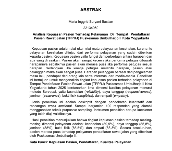Bastian, Maria Inggrid Suryani and Rustiyanto, Ery and Sulaiman, Fadia (2025) ANALISIS KEPUASAN PASIEN TERHADAP PELAYANAN DI TEMPAT PENDAFTARAN PASIEN RAWAT JALAN (TPPRJ) PUSKESMAS UMBULHARJO 2 KOTA YOGYAKARTA. Diploma thesis, Politeknik Kesehatan Bhakti Setya Indonesia.