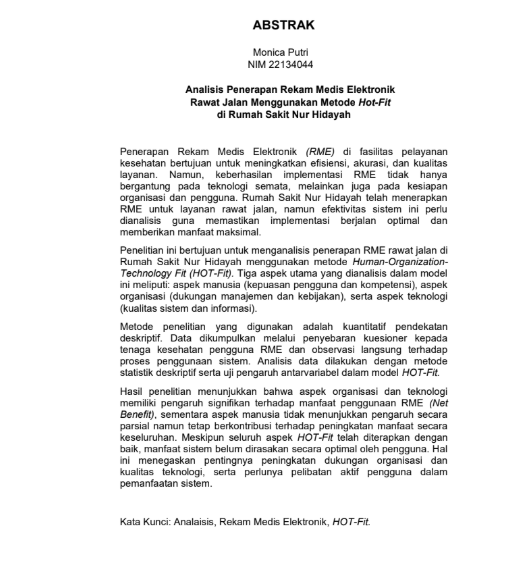 Putri, Monica and Sulistyo, Andhy and Rustiyanto, Ery (2025) ANALISIS PENERAPAN REKAM MEDIS ELEKTRONIK RAWAT JALAN MENGGUNAKAN METODE HOT-FIT DI RUMAH SAKIT NUR HIDAYAH. Diploma thesis, Politeknik Kesehatan Bhakti Setya Indonesia.