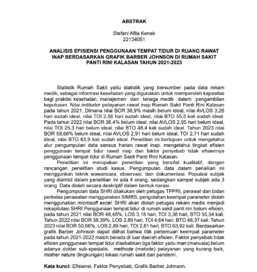 Kenak, Stefani Afila and Rustiyanto, Ery and Fitriana, Syarah Mazaya (2025) ANALISIS EFISIENSI PENGGUNAAN TEMPAT TIDUR DI RUANG RAWAT INAP BERDASARKAN GRAFIK BARBER JOHNSON DI RUMAH SAKIT PANTI RINI KALASAN TAHUN 2021-2023. Diploma thesis, Politeknik Kesehatan Bhakti Setya Indonesia.