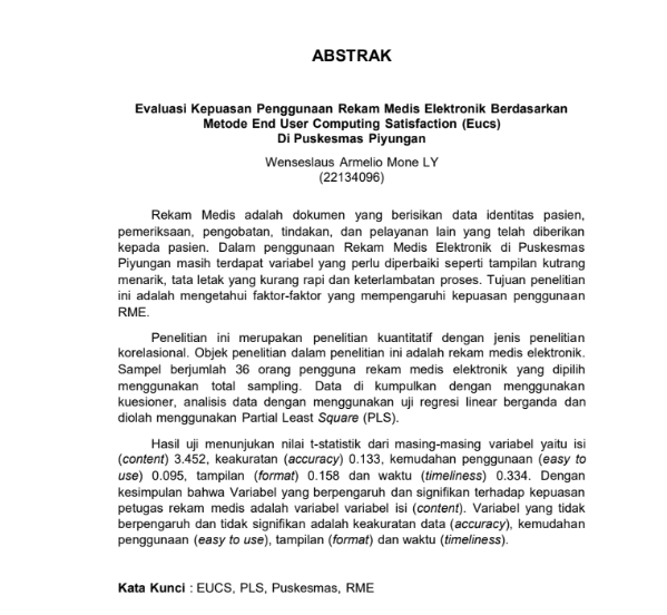 LY, Wenseslaus Armelio Mone and Urbanantika, Regita and Sari, Ana Lukita Dewi (2025) EVALUASI KEPUASAN PENGGUNAAN REKAM MEDIS ELEKTRONIK BERDASARKAN METODE END USER COMPUTING SATISFACTION (EUCS) DI PUSKESMAS PIYUNGAN. Diploma thesis, Politeknik Kesehatan Bhakti Setya Indonesia.