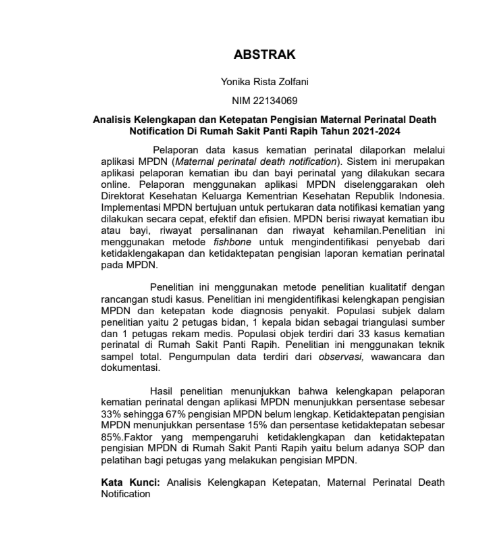 Zolfani, Yonika Rista and Widowati, Vidya and Pratama, Muhammad Hamdani (2025) ANALISIS KELENGKAPAN DAN KETEPATAN PENGISIAN MATERNAL PERINATAL DEATH NOTIFICATION DI RUMAH SAKIT PANTI RAPIH TAHUN 2021-2024. Diploma thesis, Politeknik Kesehatan Bhakti Setya Indonesia.