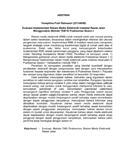 Ratnasari, Yosephina Putri and Urbanantika, Regita and Sari, Ana Lukita Dewi (2025) EVALUASI IMPLEMENTASI REKAM MEDIS ELEKTRONIK INSTALASI RAWAT JALAN MENGGUNAKAN METODE TAM DI PUSKESMAS SEWON 1. Diploma thesis, Politeknik Kesehatan Bhakti Setya Indonesia.