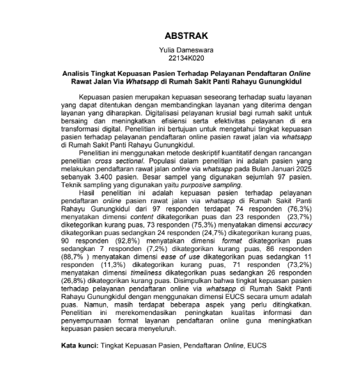 Dameswara, Yulia and Rohman, Hendra and Kurniawati, Intan (2025) ANALISIS TINGKAT KEPUASAN PASIEN TERHADAP PELAYANAN PENDAFTARAN ONLINE RAWAT JALAN VIA WHATSAPP DIRUMAH SAKIT PANTI RAHAYU GUNUNGKIDUL. Diploma thesis, Politeknik Kesehatan Bhakti Setya Indonesia.