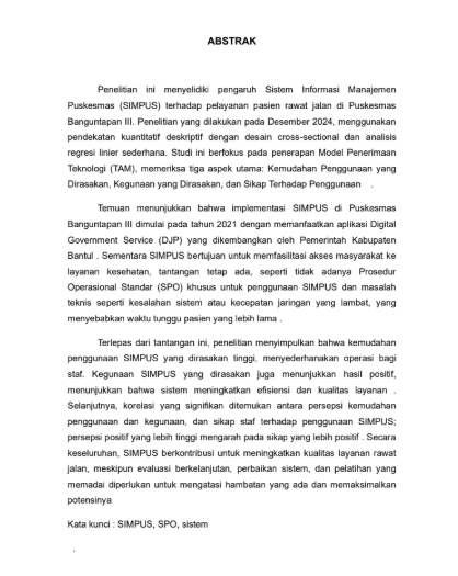 Selanjutnya, korelasi yang signifikan ditemukan antara persepsi kemudahan penggunaan dan kegunaan, dan sikap staf terhadap penggunaan SIMPUS; persepsi positif yang lebih tinggi mengarah pada sikap yang lebih positif. Secara keseluruhan, SIMPUS berkontribusi untuk meningkatkan kualitas layanan rawat jalan, meskipun evaluasi berkelanjutan, perbaikan sistem, dan pelatihan yang memadai diperlukan untuk mengatasi hambatan yang ada dan memaksimalkan potensinya