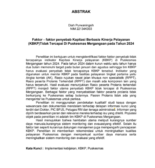 Purwaningsih, Diah and Saputro, Agung Dwi and Kurniawati, Intan (2025) FAKTOR-FAKTOR PENYEBAB KAPITASI BERBASIS KINERJA PELAYANAN (KBKP) TIDAK TERCAPAI DIPUSKESMAS MERGANGSAN. Diploma thesis, Politeknik Kesehatan Bhakti Setya Indonesia.