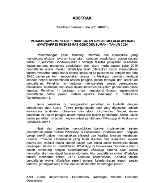 Perkembangan pesat teknologi informasi dan komunikasi yang mendukung efisiensi layanan kesehatan, termasuk pendaftaran pasien secara online. Puskesmas Gondokusuman I sebagai fasilitas pelayanan Kesehatan tingkat pertama mengelola pendaftaran dan rekam medis pasien, sejak 2019 pendaftaran online melalui WhatsApp telah diterapkan untuk memudahkan pasien mendaftar tanpa harus datang langsung ke puskesmas, dengan rata-rata 15-20 pasien per hari menggunakan layanan ini. Meskipun demikian, terdapat kendala seperti keterlambatan respon petugas, pesan terlewat, dan kekeliruan pendaftaran. Penelitian ini bertujuan menganalisis proses perencanaan, mekanisme, hambatan, dan solusi dalam implementasi sistem pendaftaran online tersebut. Penelitian ini bertujuan untuk mengetahui tinjauan implementasi pendaftaran online pasien melalui aplikasi WhatsApp di Puskesmas Gondokusuman I.