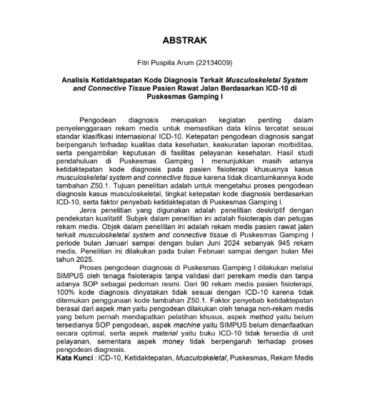 Arum, Fitri Puspita and Widowati, Vidya and Setyawan, Hery (2025) ANALISIS KETIDAKTEPATAN KODE DIAGNOSIS TERKAIT MUSCULOSKELETAL SYSTEM AND CONNECTIVE TISSUE PASIEN RAWAT JALAN BERDASARKAN ICD-10 DI PUSKESMAS GAMPING I. Diploma thesis, Politeknik Kesehatan Bhakti Setya Indonesia.