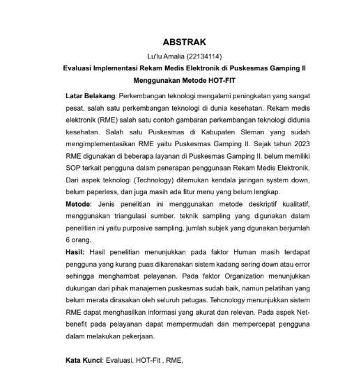 Amalia, Lu’lu and Sugeng, Sugeng and Mawardi, M. Imron (2025) EVALUASI IMPLEMENTASI REKAM MEDIS ELEKTRONIK DI PUSKESMAS GAMPING II SLEMAN MENGGUNAKAN METODE HOT-FIT. Diploma thesis, Politeknik Kesehatan Bhakti Setya Indonesia.