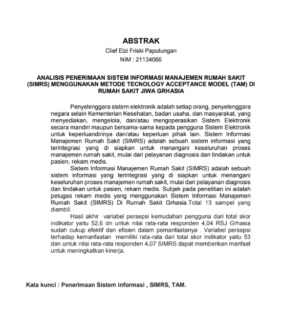 Paputungan, Clief Elzi Friski and Rohman, Hendra and Saputro, Agung Dwi (2024) ANALISIS PENERIMAAN SISTEM INFORMASI MANAJEMEN RUMAH SAKIT (SIMRS) MENGGUNAKAN METODE TECNOLOGY ACCEPTANCE MODEL (TAM) DI RUMAH SAKIT JIWA GRHASIA. Diploma thesis, Politeknik Kesehatan Bhakti Setya Indonesia.