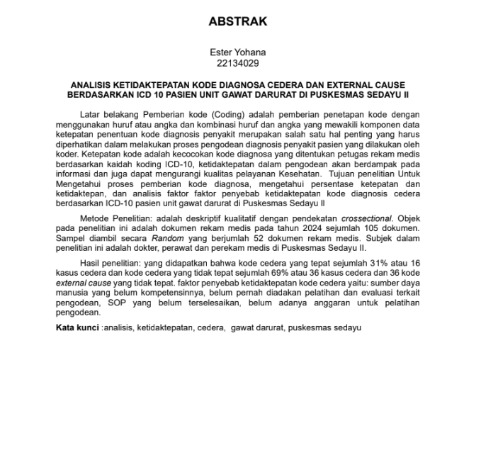 Yohana, Ester and Widowati, Vidya and Setyawan, Hery (2024) ANALISIS KETIDAKTEPATAN KODE DIAGNOSA CEDERA DAN EXTERNAL CAUSE BERDASARKAN ICD 10 PASIEN UNIT GAWAT DARURAT DI PUSKESMAS SEDAYU II. Diploma thesis, Politeknik Kesehatan Bhakti Setya Indonesia.