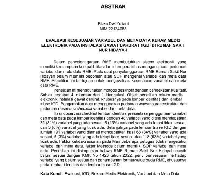Dalam penyelenggaraan RME membutuhkan sistem elektronik yang memiliki kemampuan kompatibilitas dan interoperabilitas mengacu pada pedoman variabel dan meta data RME. Pada saat penyelenggaraan RME Rumah Sakit Nur Hidayah belum memiliki pedoman atau SOP mengenai variabel dan meta data RME. Penelitian ini bertujuan untuk mengevaluasi kesesuaian variabel dan meta data RME.